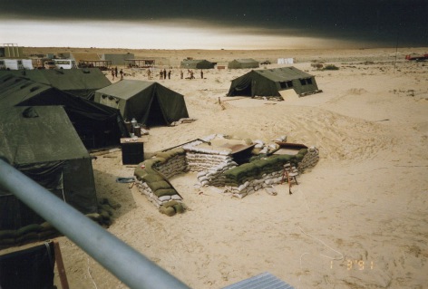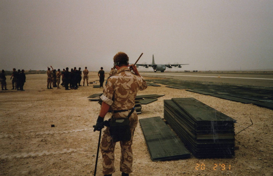 In the early stages of our deployment the weather was very hot and sunny as would be expected in the desert at this time of year, so building runways was particularly hard work. However, as the conflict developed and the Iraq military forces set light to the oil fields, the otherwise blue sky quickly became a very strange black colour, blocking out much of the sun and making it surprisingly cold and very wet at times.